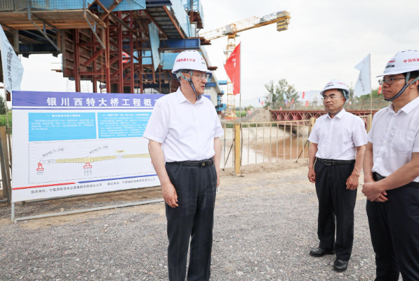 李邑飛在銀巴支線鐵路——跨西干渠特大橋項目現(xiàn)場,了解全區(qū)鐵路項目規(guī)劃建設(shè)推進情況。