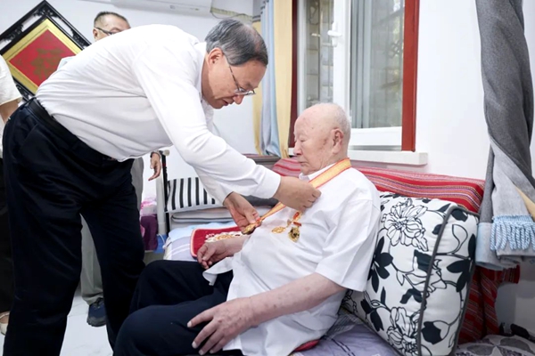 李邑飛在銀川市看望慰問(wèn)抗戰(zhàn)老戰(zhàn)士柴顯忠,為老人佩戴“中國(guó)人民抗日戰(zhàn)爭(zhēng)勝利80周年”紀(jì)念章。寧夏日?qǐng)?bào)記者 黨碩 攝