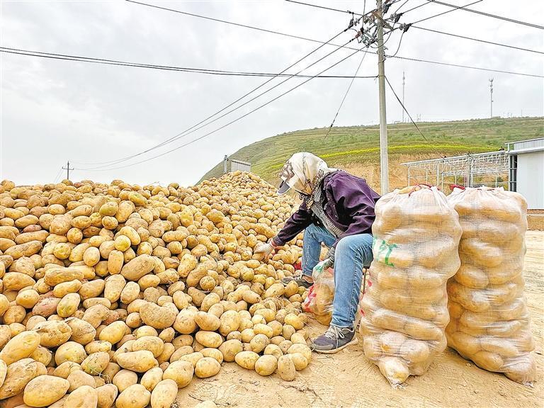 窯兒村村民將馬鈴薯裝袋稱重。