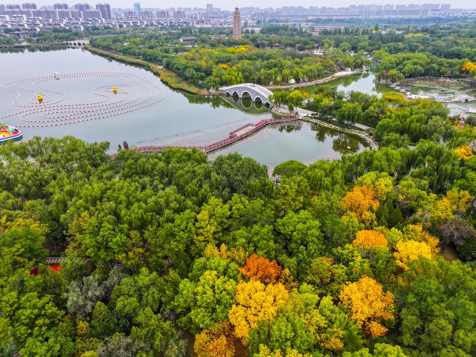 10月9日,俯瞰銀川海寶公園,仿佛走進(jìn)了夢(mèng)幻般的秋日童話(huà)世界。寒露已過(guò),湖城銀川的公園里各種樹(shù)木的葉子紛紛變黃,構(gòu)成了一幅生動(dòng)的秋日畫(huà)卷。 記者 馬楠 攝