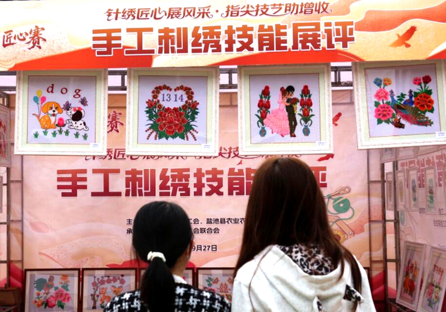 手工刺繡技能展評現(xiàn)場。