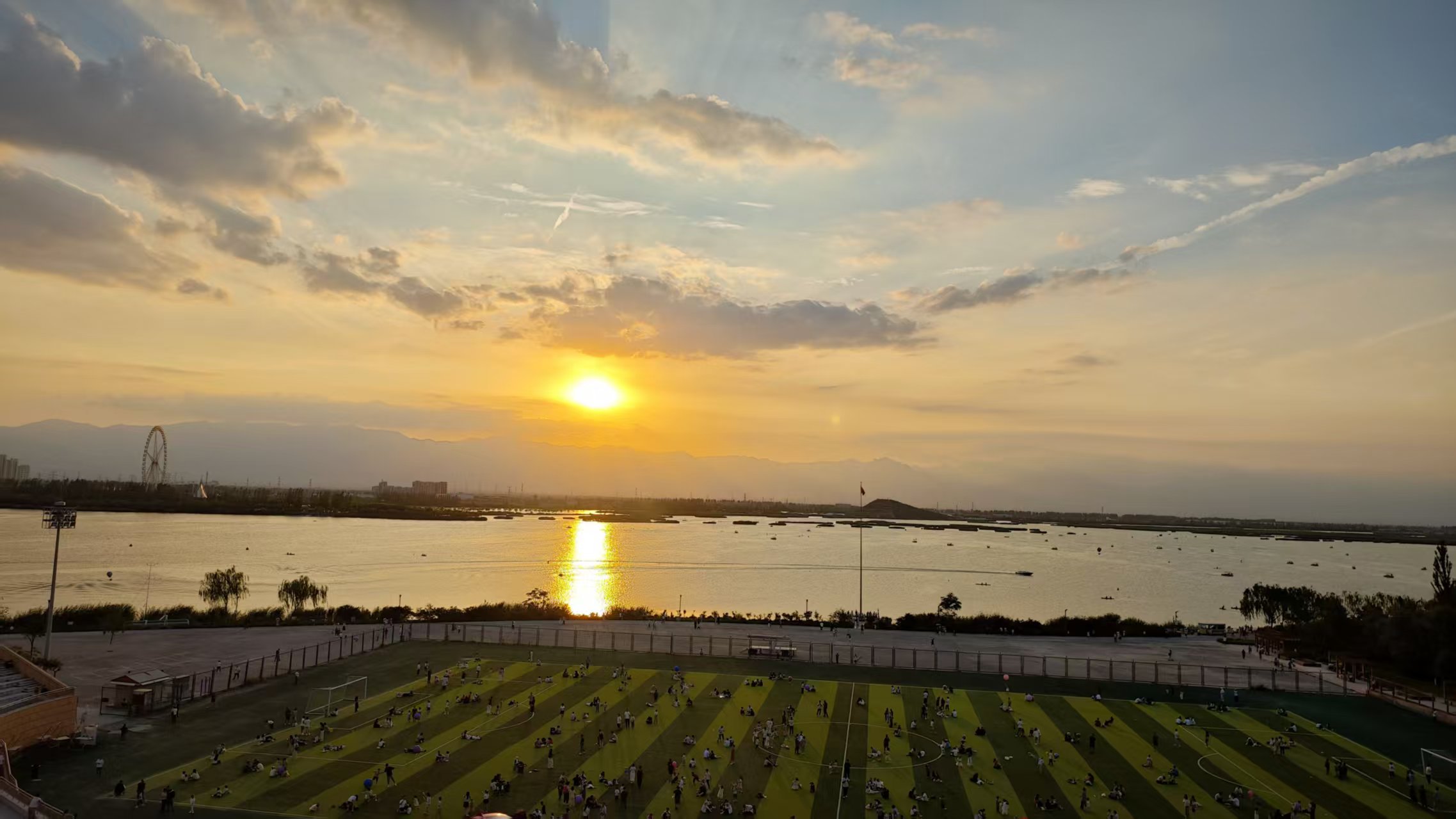 夕陽西下,巍峨的賀蘭山與閱海湖披上金色霞光,大家在領(lǐng)唱歌手的帶領(lǐng)下,共同唱響《團(tuán)結(jié)就是力量》《美麗中國》《我的祖國》《我愛你中國》等歌曲,提前為祖國送上生日祝福。覽山落日見證了他們在賽道上拼搏、在崗位上付出的身影,也聆聽著他們勝利的歡歌和對祖國的深情。