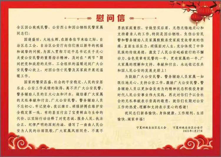 自治區(qū)總工會將繼續(xù)加強(qiáng)與自治區(qū)公安廳的協(xié)調(diào)對接,進(jìn)一步完善公安民警困難幫扶慰問等工作機(jī)制,努力做好關(guān)心關(guān)愛公安民警特別是公安烈士、因公犧牲家屬和因公傷殘公安民警工作,為建設(shè)平安寧夏貢獻(xiàn)工會力量。